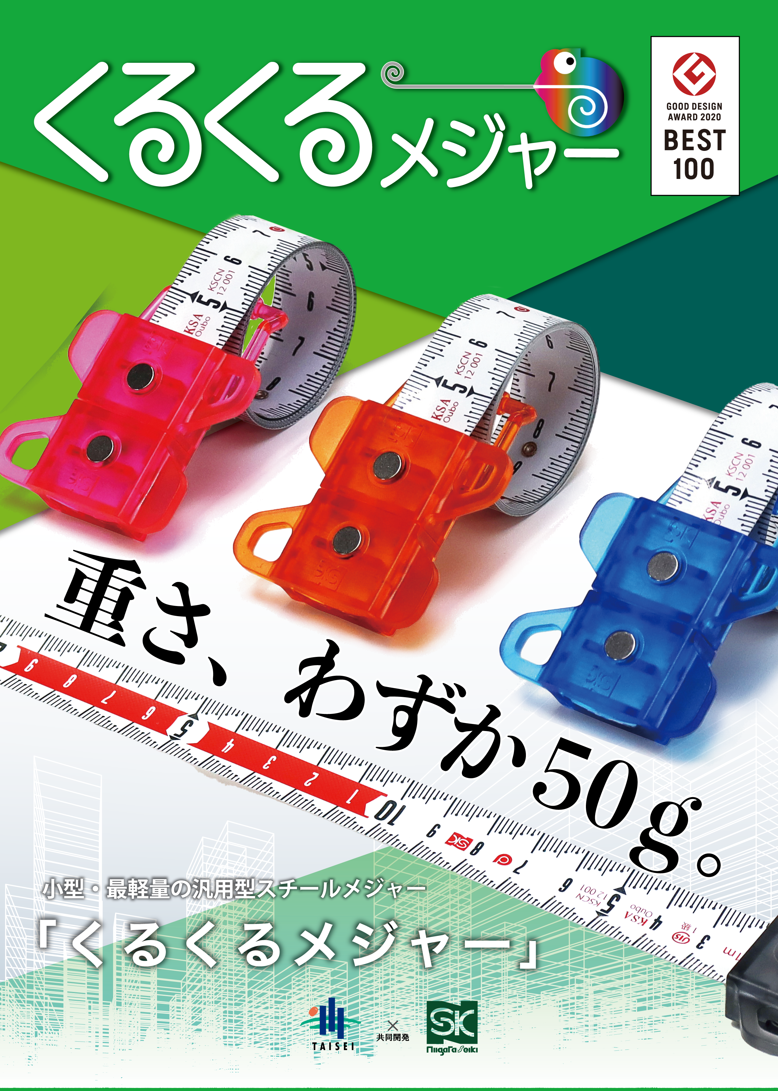 大成建設株式会社と精密測定工具製造会社の新潟精機株式会社が共同で、建設工事での計測作業に適した小型・最軽量の汎用型スチールメジャー「くるくるメジャー」を開発しました。